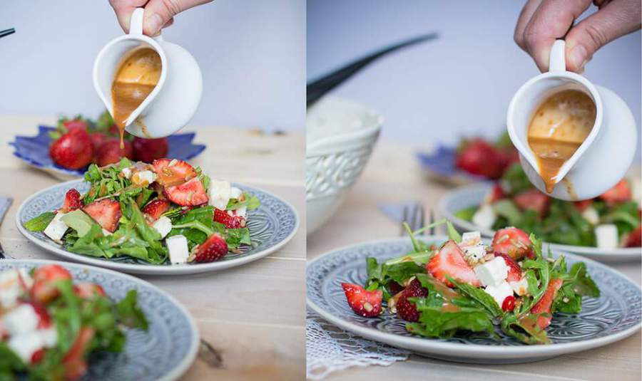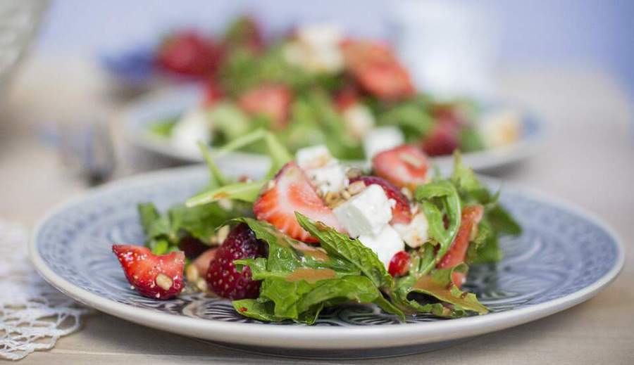8. Все измельченные ингредиенты добавьте в миску с зеленью и перемешайте. Выложите салат на блюдо или порционные тарелки, полейте соусом и посыпьте свежемолотым черным перцем. Салат с клубникой, фетой и чили готов.
