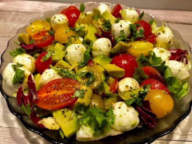 Салат з моцарелою, авокадо та помідорами можна подати до столу як легку вечерю або ж як додаток до страв на грилі – м'ясних, рибних, овочевих. У ньому передбачається використовувати упаковку міні-кульок моцарели, салатний мікс, підібраний на ваш розсуд, і помідори чері (червоні, жовті або ті й інші в суміші).