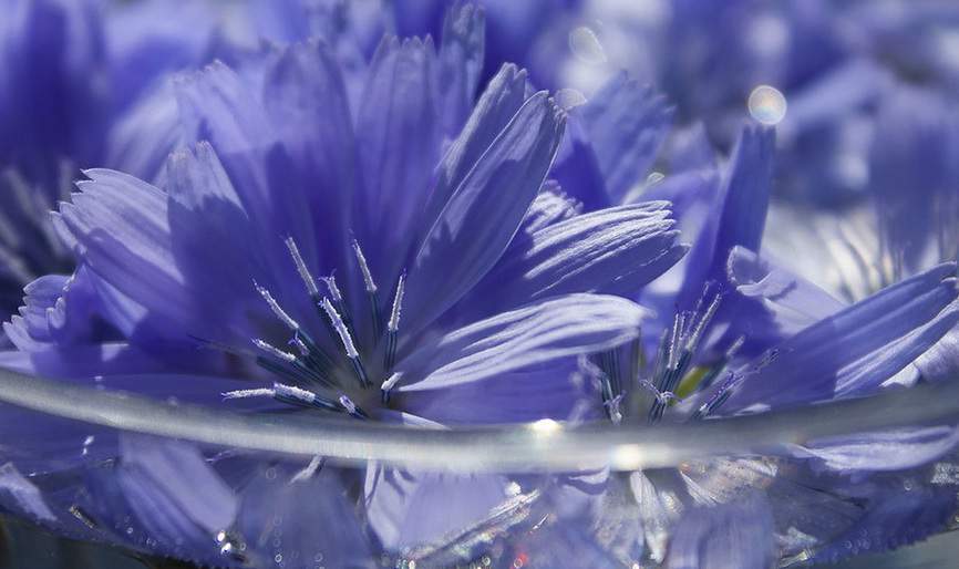 Готовить салат с цветами цикория можно не только в пору его цветения, но и в любое время, заморозив их в кубиках льда. Правда, как украшение такой оттаявший цветок уступает свежему цветку, но вкус, слегка напоминающий салат-латук, сохраняет полностью.