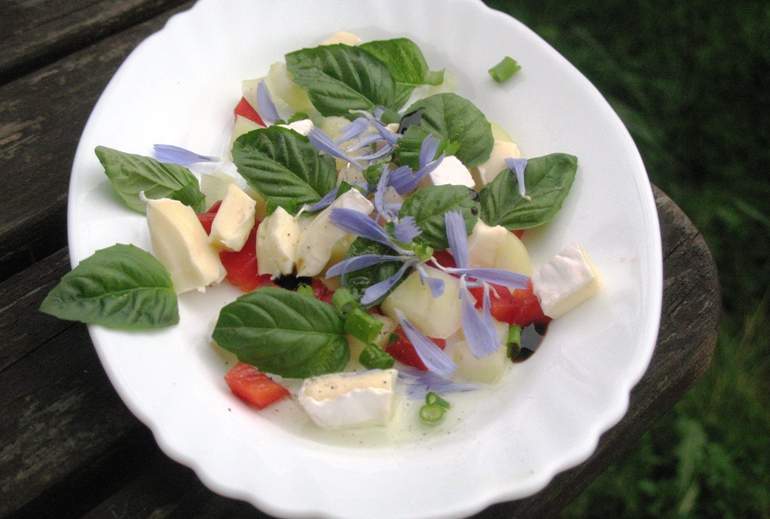 4. Разложите на две тарелки кубики сладкого перца, а на него – листья базилика вперемешку с зеленым луком и кубиками сыра бри. Притрусите салат лепестками цветов цикория и сбрызните оливковым маслом.