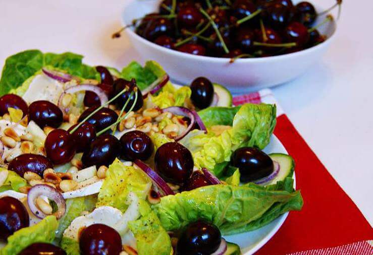 9. Перед подачей салат с черешнями и козьим сыром полейте заправкой и посыпьте остывшими кедровыми орешками.