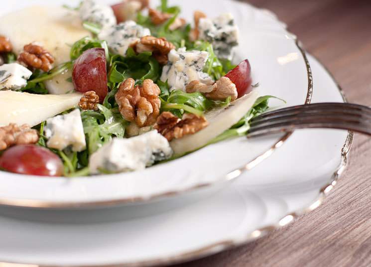 7. Салат с голубым сыром и грушей подайте с поджаренным багетом и бокалом вина.