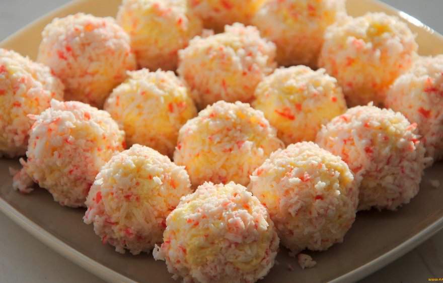 6. Сформируйте руками небольшие аккуратные шарики, обваляйте в красной части крабовых палочек, и выложите на сервировочное блюдо, выложенное листьями салата. Впрочем, если листьев салата нет, можно без них обойтись.