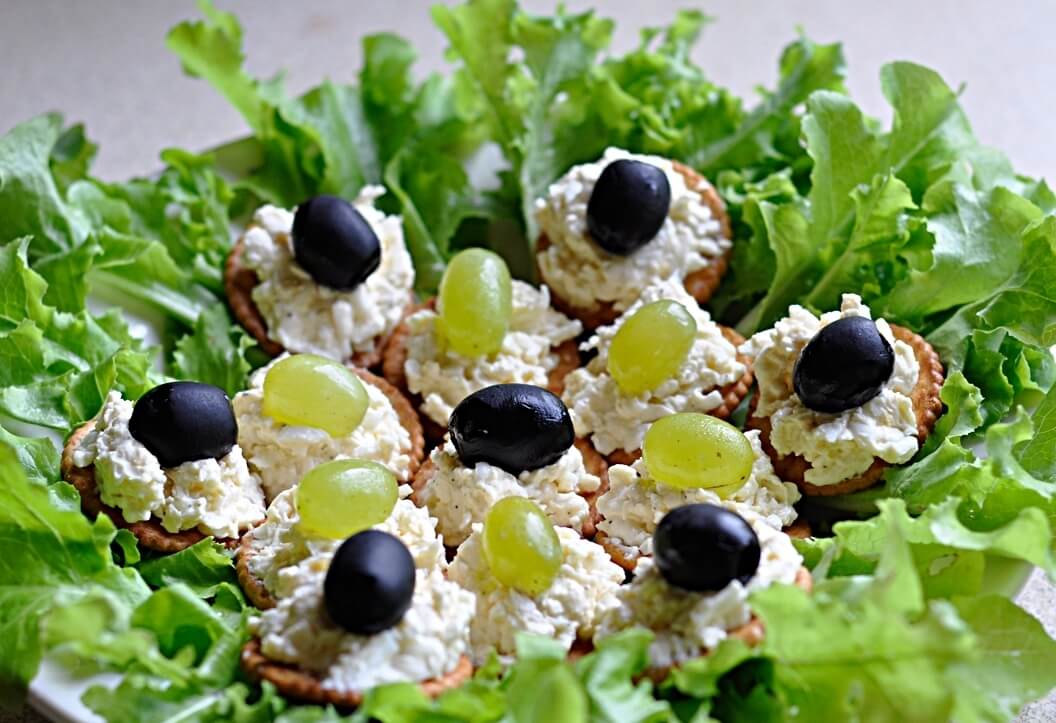 6.Оформленный на крекерах, салат разложите на блюде сверху зеленых листьев. Готовый салат из плавленых сырков с оливками и виноградом на крекерах можно подавать к столу.