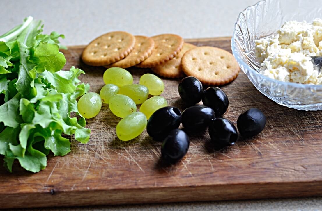 Готовим салат из плавленых сырков с оливками и виноградом на крекерах
