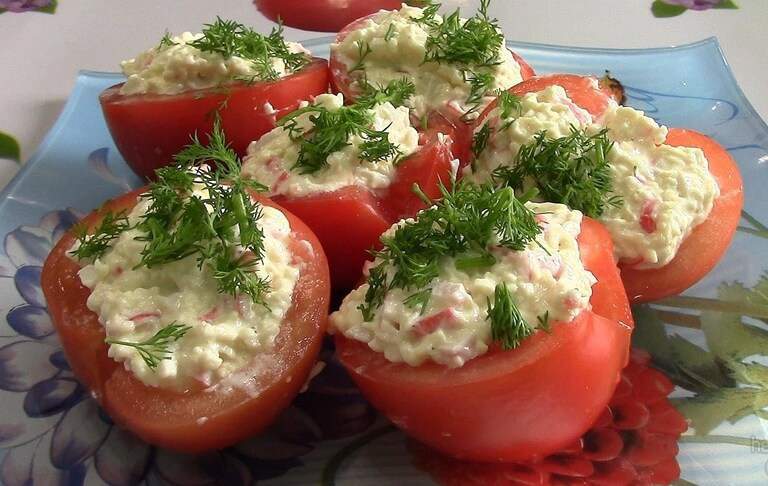 7. Пустые помидорные чашечки наполните салатом и посыпьте сверху рубленой зеленью. Салат из плавленых сырков в помидорах сложите на сервировочное блюдо и подайте к праздничному столу.