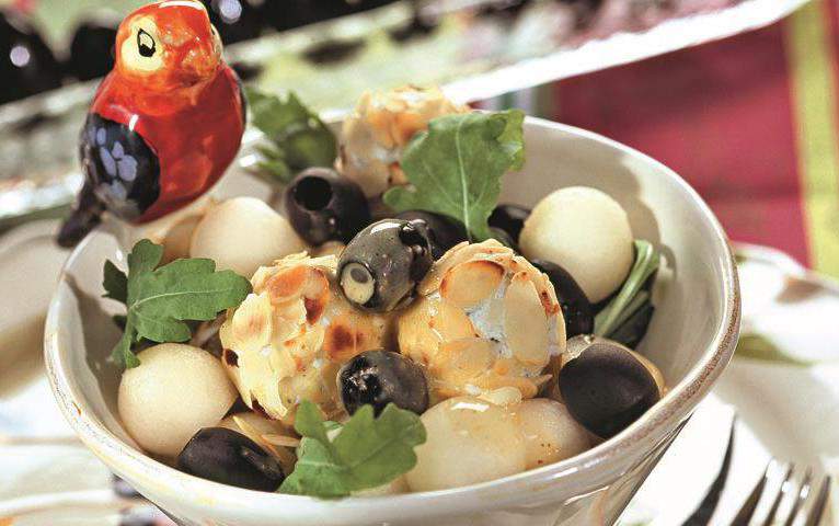 5. Сделайте шарики из дыни специальной выемкой. Обваляйте орешки из сыра, а пластинка жаренного миндаля.