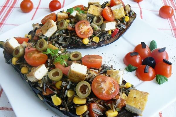 Готовим салат из тофу с диким рисом в лодочках из баклажана