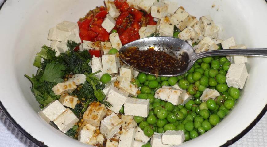 Тофу – вкусный и полезный продукт, изготавливаемый из бобов сои, который часто называют сыром из-за схожей текстуры. Из этого продукта можно приготовить множество интересных блюд. Предлагаем вашему вниманию рецепт салата из тофу с креветками и овощами для повседневного питания и на праздничный стол.