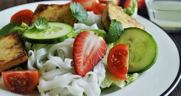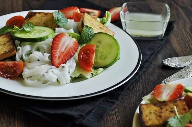 Готовим салат из тофу с рисовой лапшой и клубникой