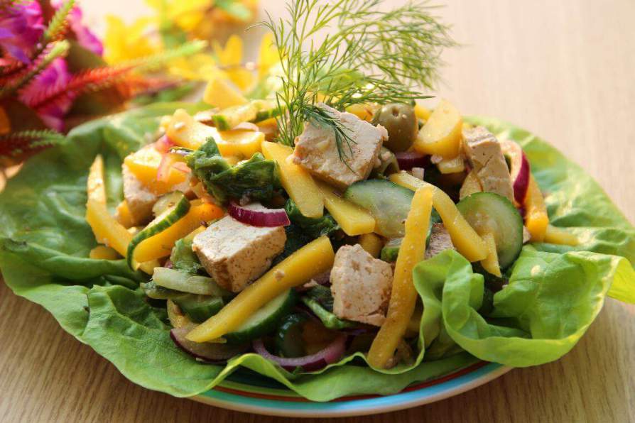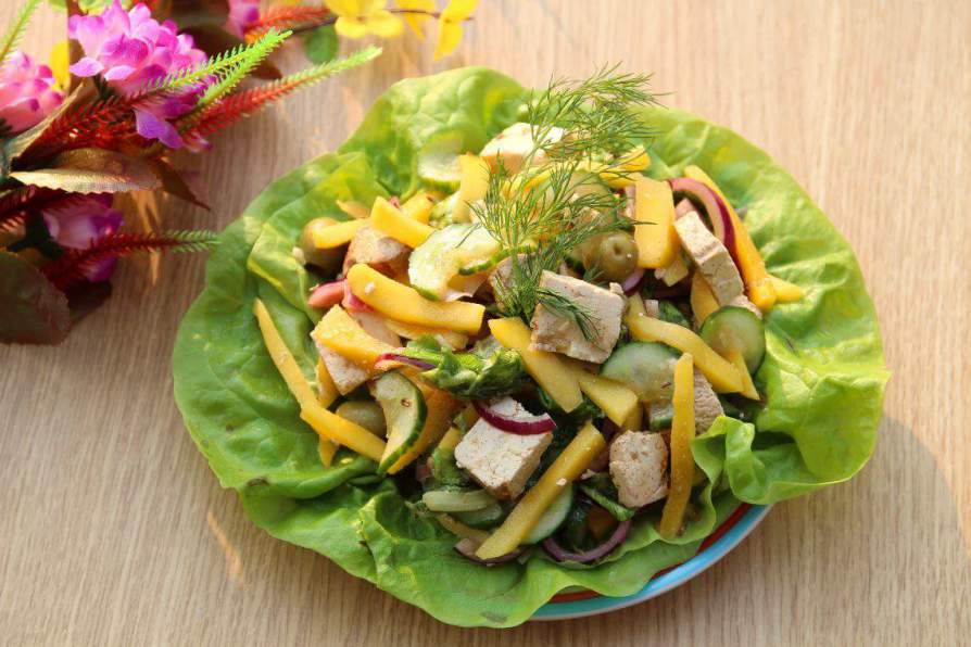 5. В глубокой просторной миске соедините тофу, манго, огурец, красный лук, оливки и перемешайте.