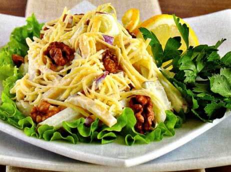 7. Очистите от скорлупы грецкие орехи и разделите на половинки или четвертинки. Разместите орехи сверху на яблоки. Готовый салат с сыром и орехами подавайте сразу же, заранее такой салат готовить не стоит.