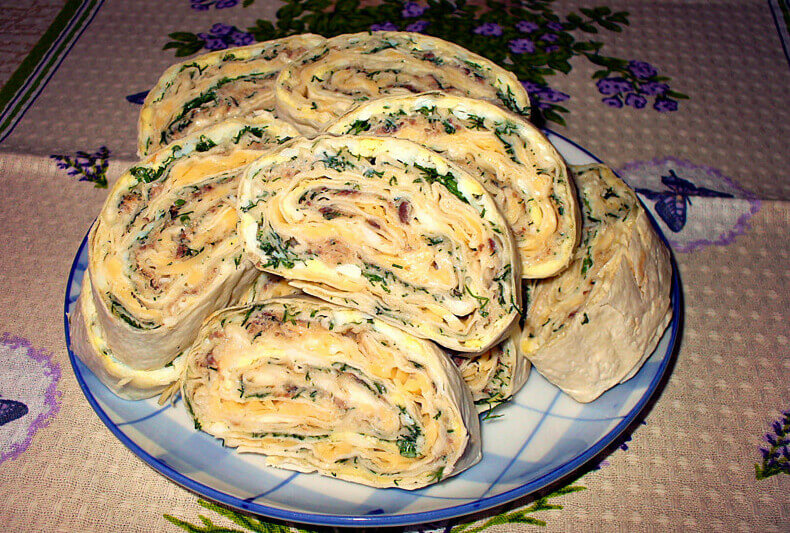 7.Настоявшийся в холодильнике салат «Мимоза» в лаваше нарежьте на кусочки, сложите на блюдо или доску и подавайте к столу как вкусную эффектную закуску.