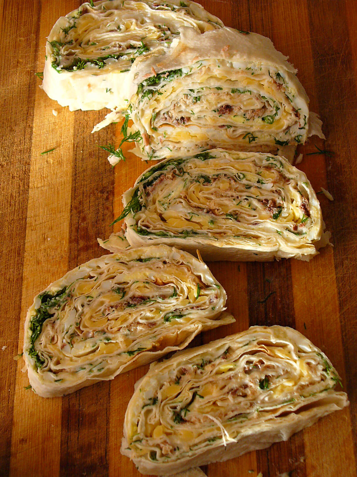 5.Третий лист смажьте майонезом, выложите остальной укроп, притрусите тертым сыром. Сверните все слои лаваша рулетом и положите его в холодильник как минимум на 2 часа, а лучше – на ночь.