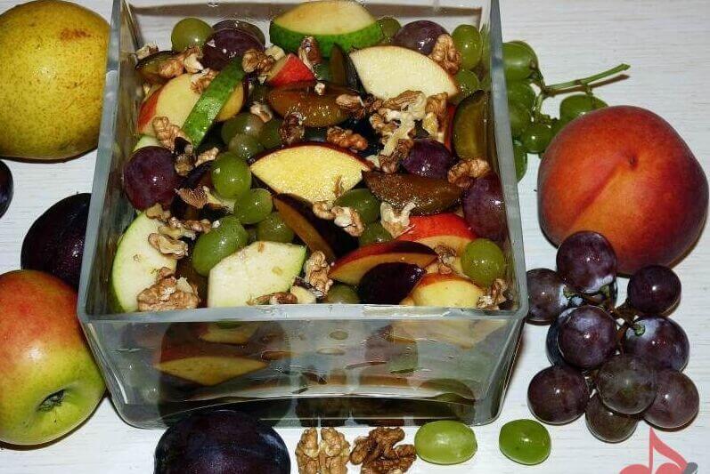 9.Ядра грецких орехов поджарьте на сухой сковороде до появления характерного аромата и посыпьте ими фруктовый осенний салат сверху. Подавайте к столу сразу после приготовления.
