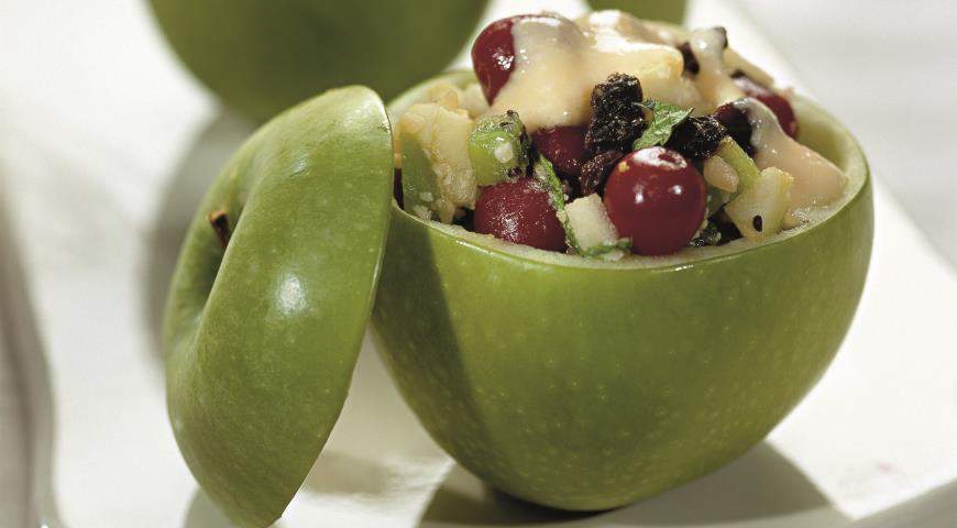 1. У вымытых яблок срежьте верхушки в виде крышечек, очень аккуратно вырежьте изнутри яблочную мякоть, сделав из плодов подобие вазочек. Крышечки сохраните. Удалив из мякоти семенные коробки, нарежьте ее кубиками.