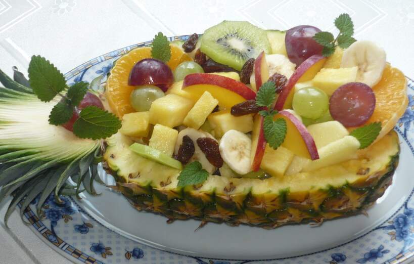 7. Полученным фруктовым салатом наполните половинки ананасов и украсьте сверху листиками мелисы.