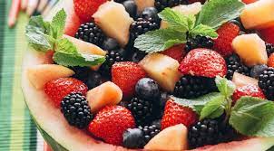 7.Готовый фруктовый салат с арбузом и ягодами переложите из миски в чашу из арбуза и подавайте к столу сразу после приготовления.