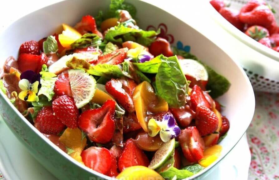 4.Сложите измельченные листья пекинской капусты в салатник, добавьте туда же ломтики клубники и персиков, посыпьте цедрой лайма, полейте соусом, сбрызните бальзамическим уксусом и апельсиновым сиропом.