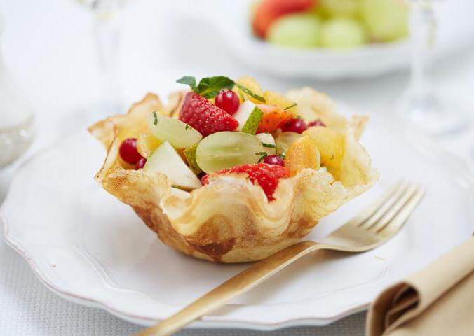8. Готовый фруктовый салат в блинных корзинках подайте к столу сразу после приготовления.