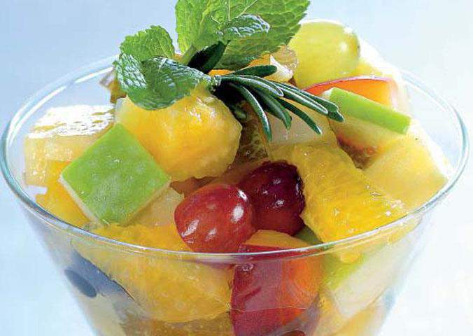 6. Мяту разберите на листочки, а у розмарина снимите только верхние листочки. Высыпьте кусочки нарезанных фруктов в креманку или вазу для салата и хорошо перемешайте.