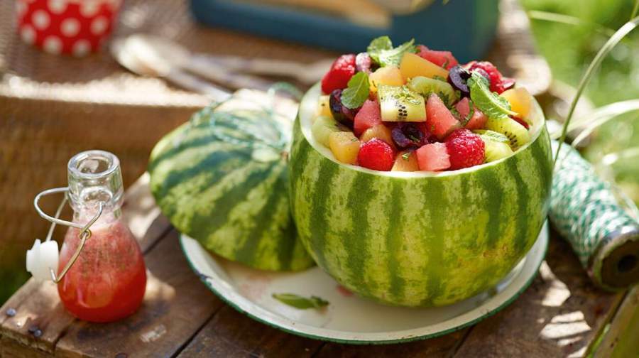 Готовим фруктовый салат в арбузе с арбузным соусом