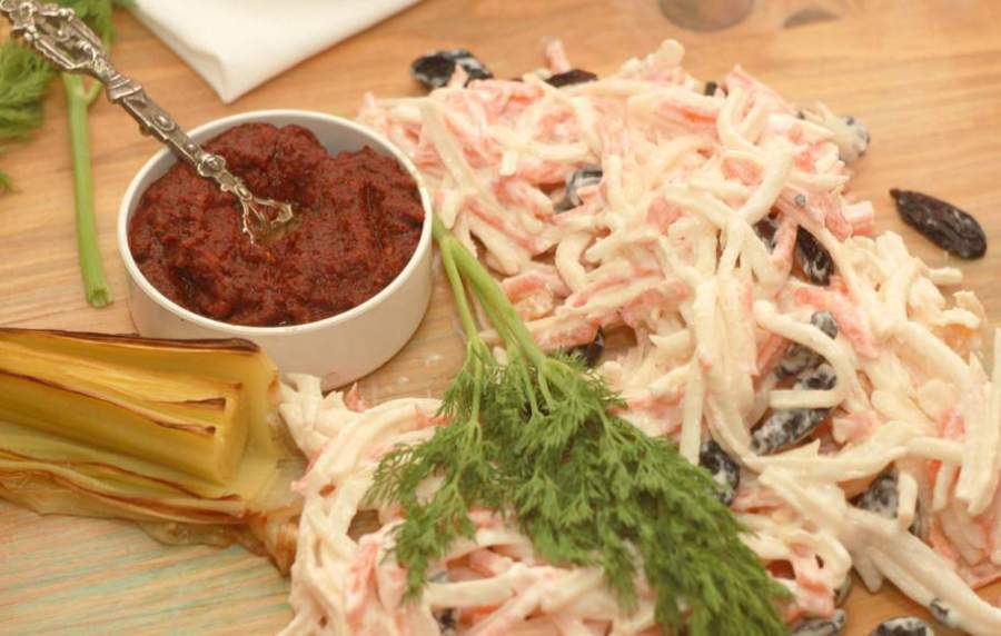 6. Вмешайте 2/3 изюма в салат. Выложите салат в салатник, сверху посыпьте остальным изюмом и подавайте к столу.