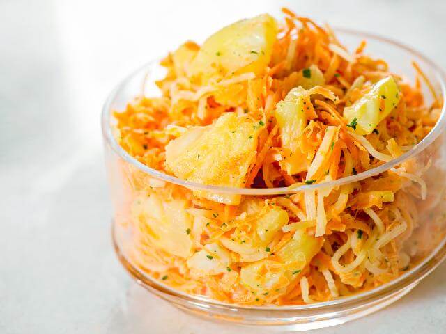 6.Сочный салат из свежего ананаса с морковью и сельдереем готов. Дайте ему постоять минут 20 минут, а затем подавайте как самостоятельную закуску или в дополнение к жареному или печеному мясу.